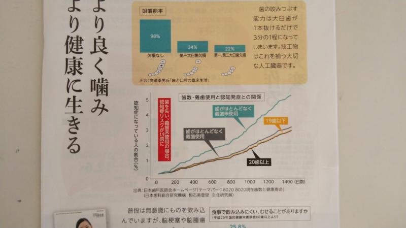 全部の歯がある人に比べて、奥歯が1本抜けるだけで3分の1程の力でしか噛む事が出来なくなります。 そして食べ物や飲み物が飲み込みにくくなり、むせたりする事が増えます。 また、歯の本数が少ないと認知症のリスクが高くなります。 歯を失った場合には義歯を入れたりして噛み合わせを回復する事で口腔機能を改善する事が出来ます。 良く噛んで健康に生きましょう♪ | 活動報告 | 広島県東広島市西条 一般歯科、歯周病治療、小児歯科、ホワイト二ング、審美歯科、予防歯科|ゆりの木歯科