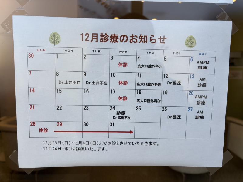 また、12月8日、9日は研修のため、土井先生はお休みとなります。