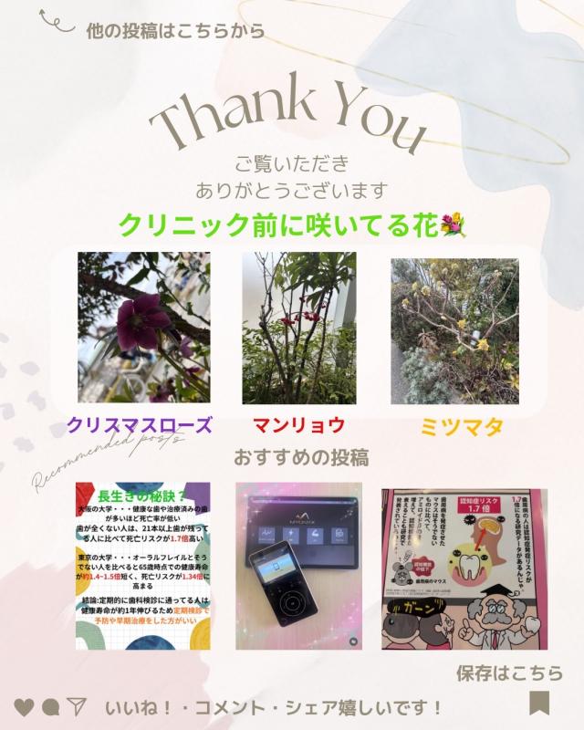3月の診療のお知らせ✨ 18日(水)は祝日の週のため診療いたします🦷 6日(金)は急遽高橋先生は午前休みとなります。 ご理解のほどよろしくお願いします🪥 クリニックの駐車場にクリスマスローズとミツマタという花💐が咲いてます。 また診療室からはマンリョウという花が見られるので、診療室の中でも花を楽しむことができます😄 | 活動報告 | 広島県東広島市西条 一般歯科、歯周病治療、小児歯科、ホワイト二ング、審美歯科、予防歯科|ゆりの木歯科